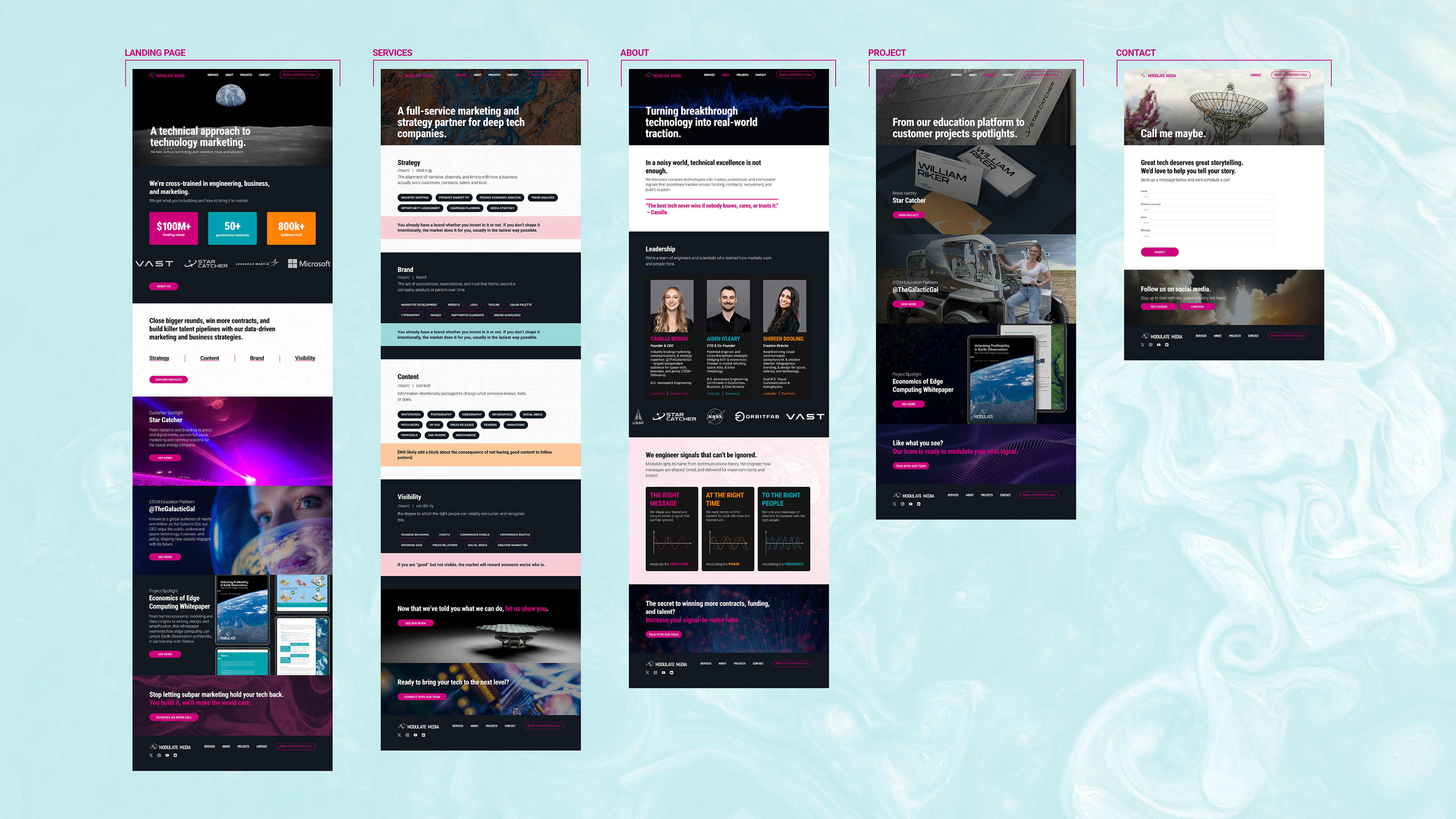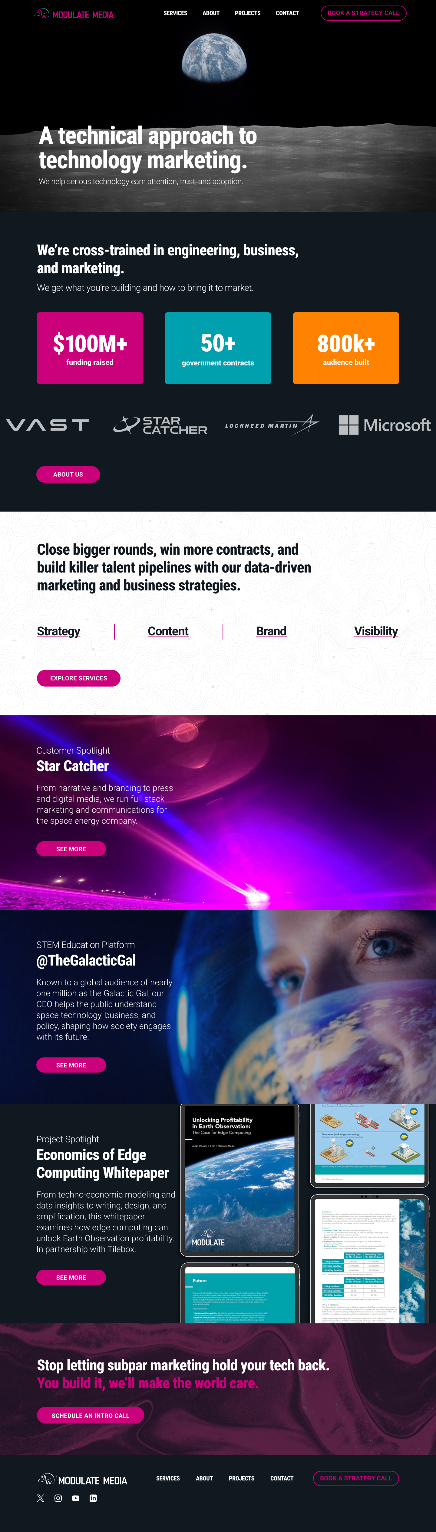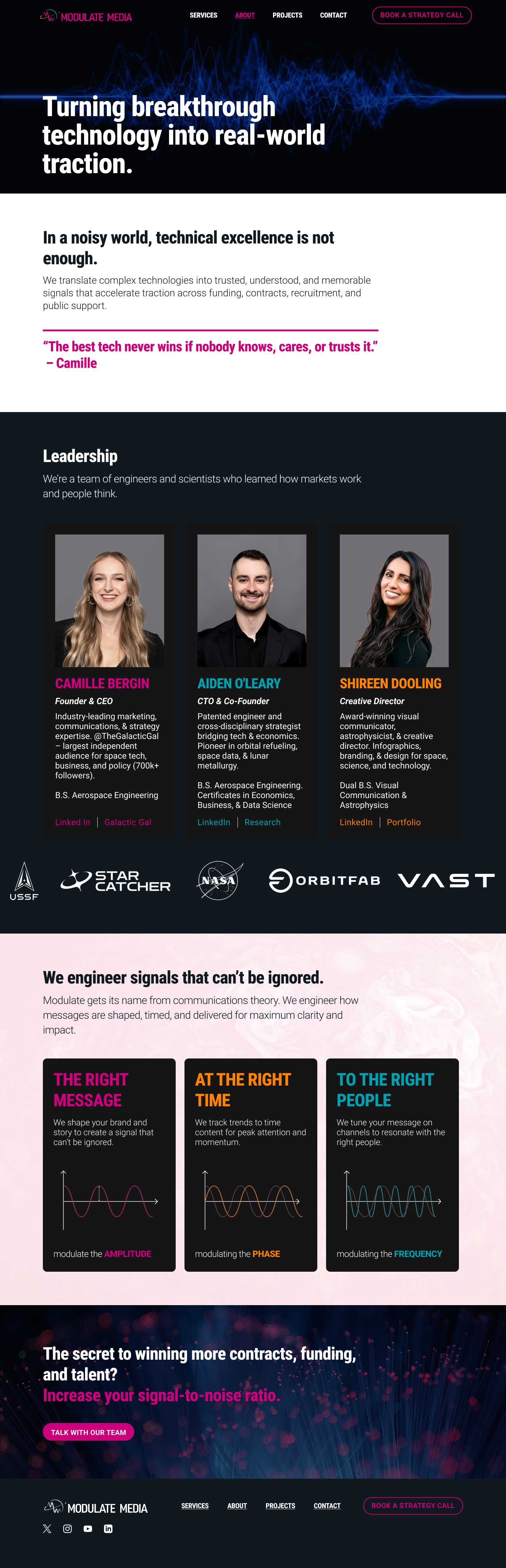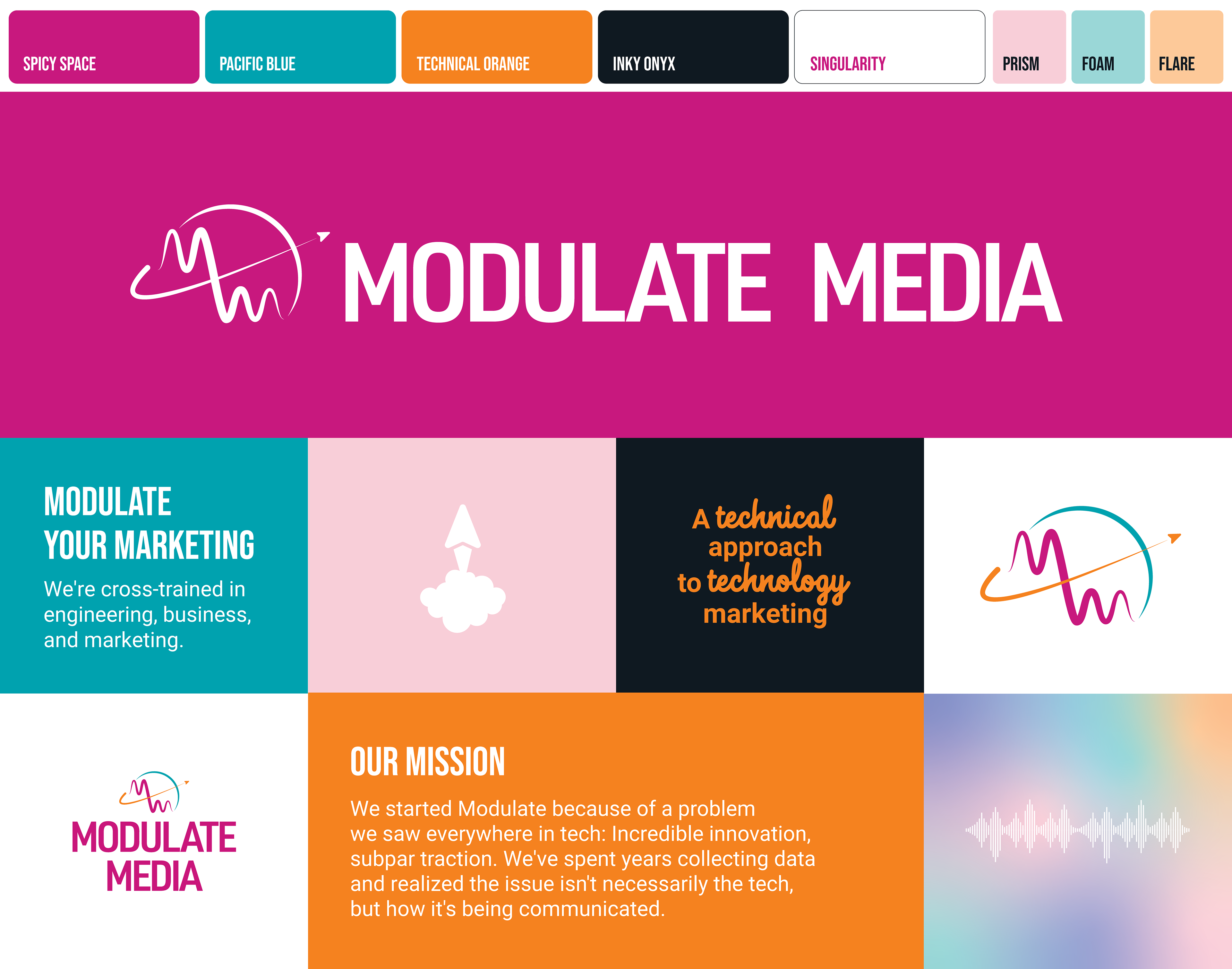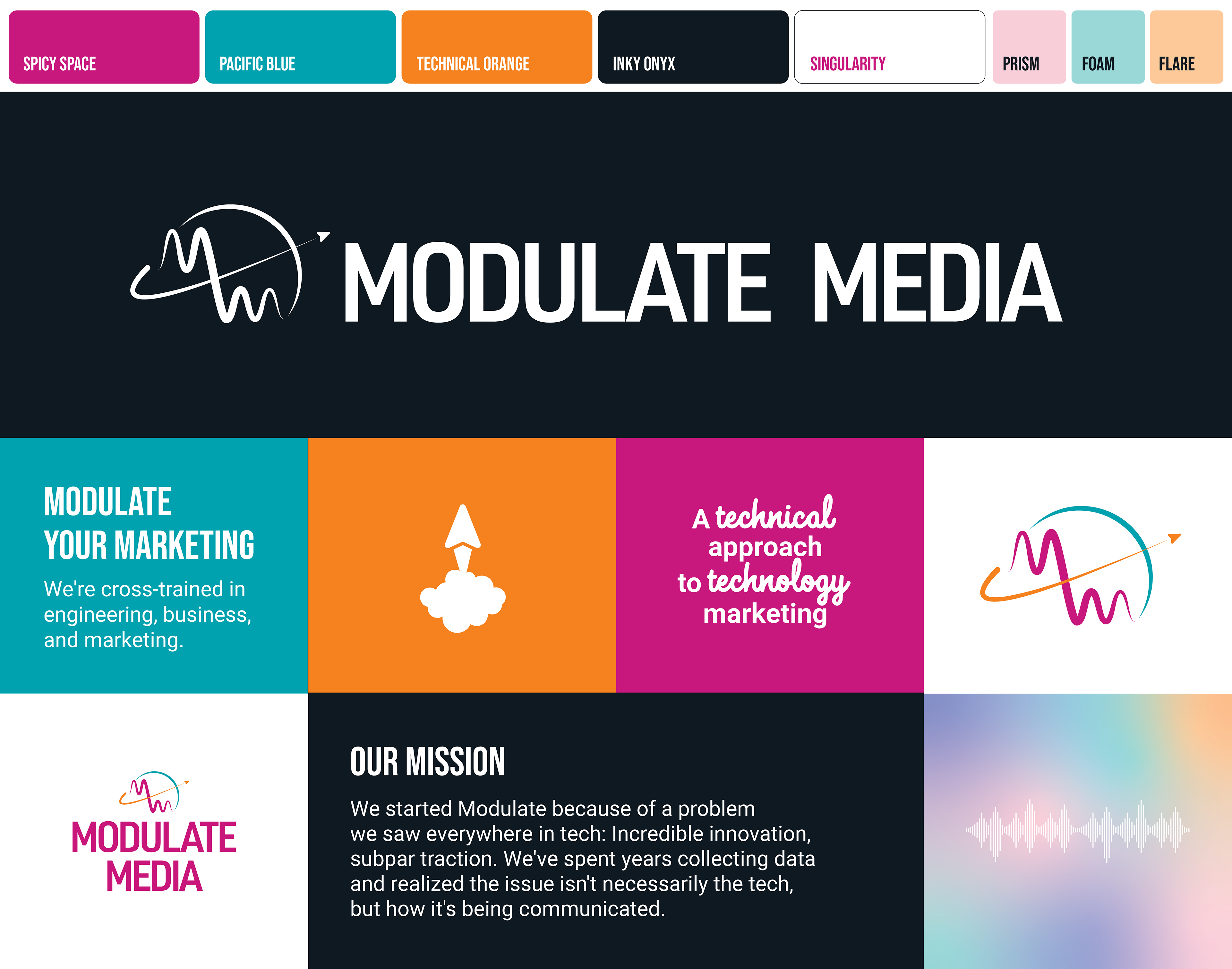 Branding Modulate Media was one of the most fun projects I've worked on. As a marketing agency that set out to cater to aerospace and deep tech industries, the team wanted something that would stand out against the darker color palettes of that demographic. I also knew I wanted to create a logo that was clever and tapped into the technical aspects of our expertise with a color palette that was vibrant, modern, and eye catching.